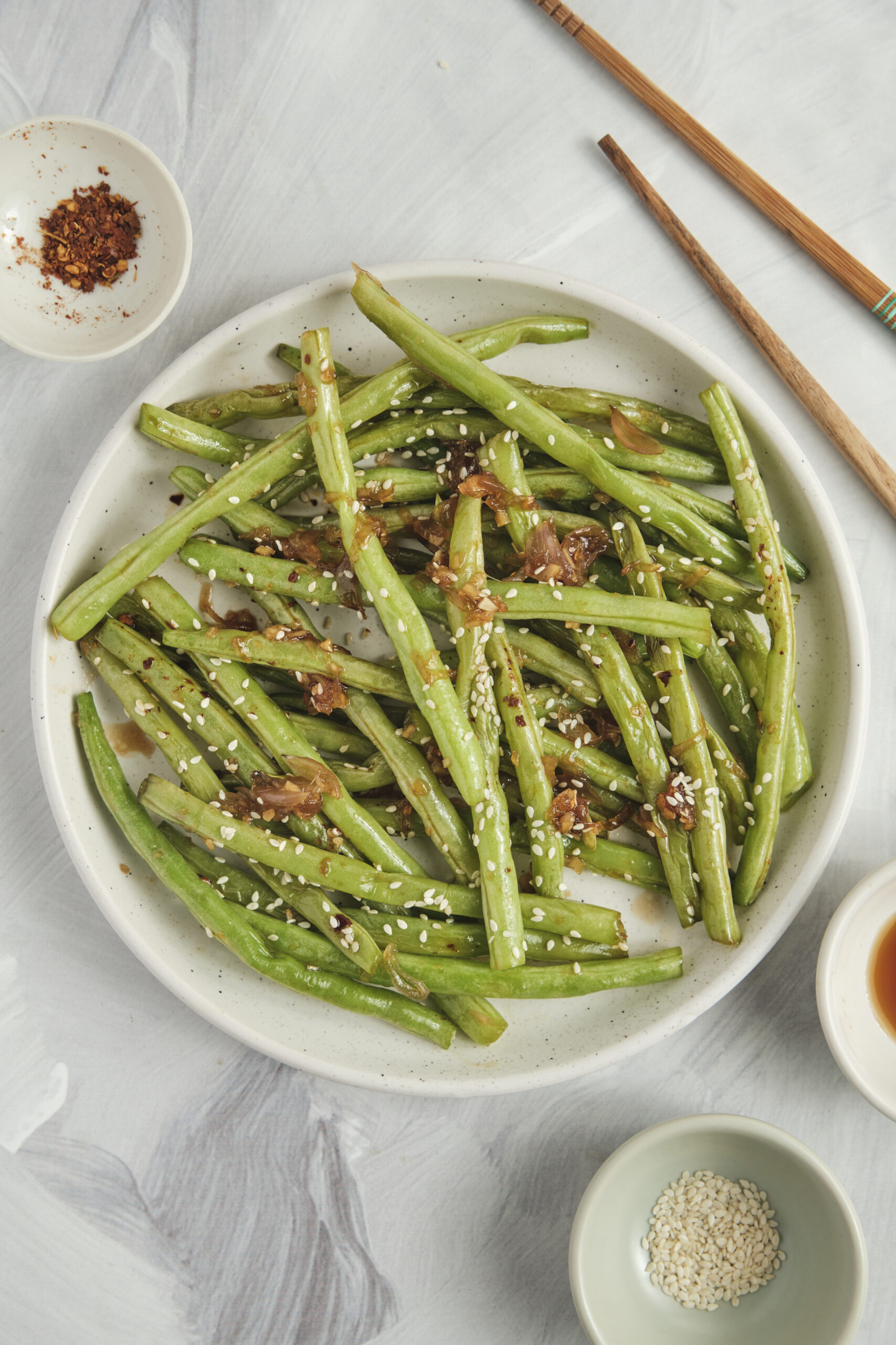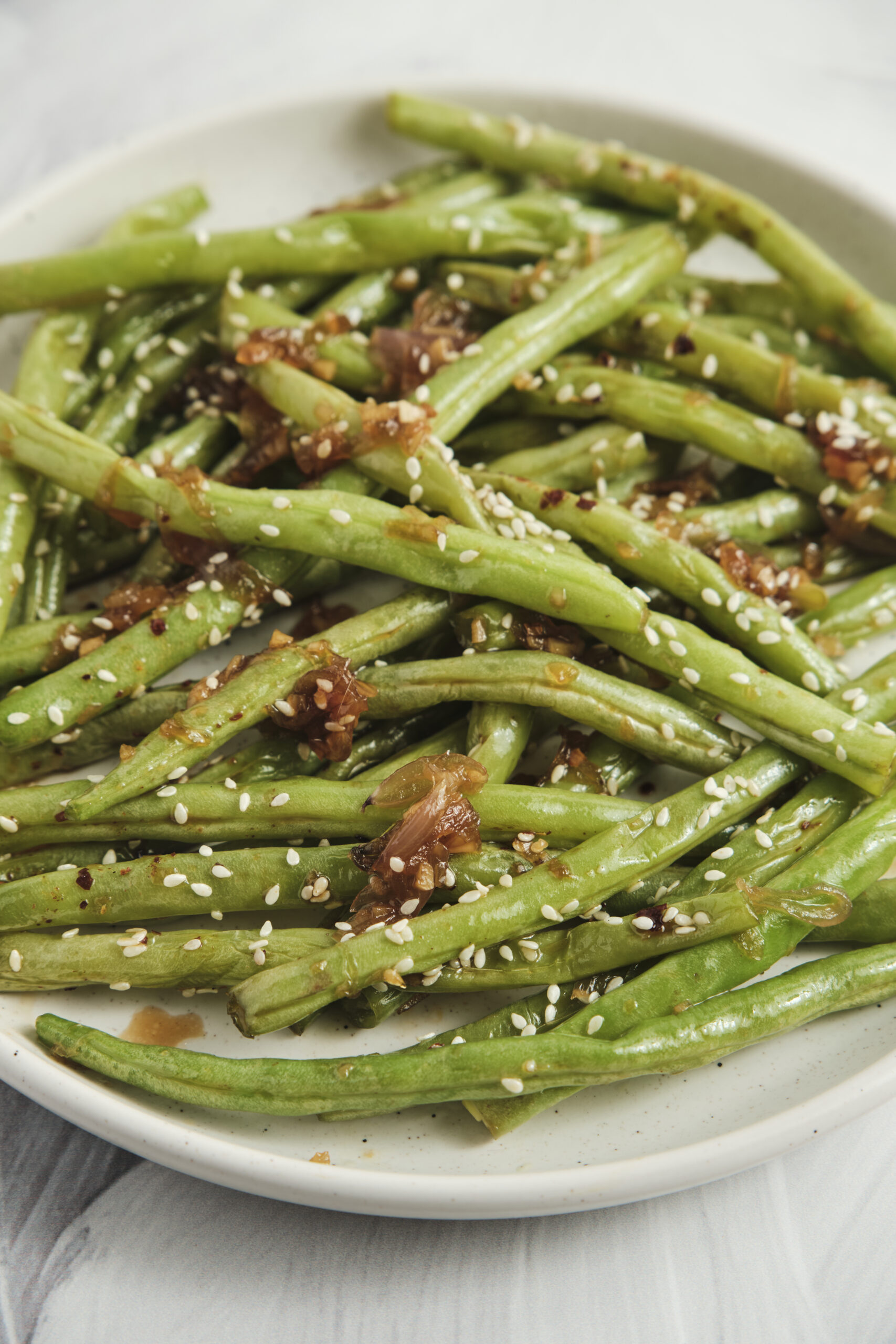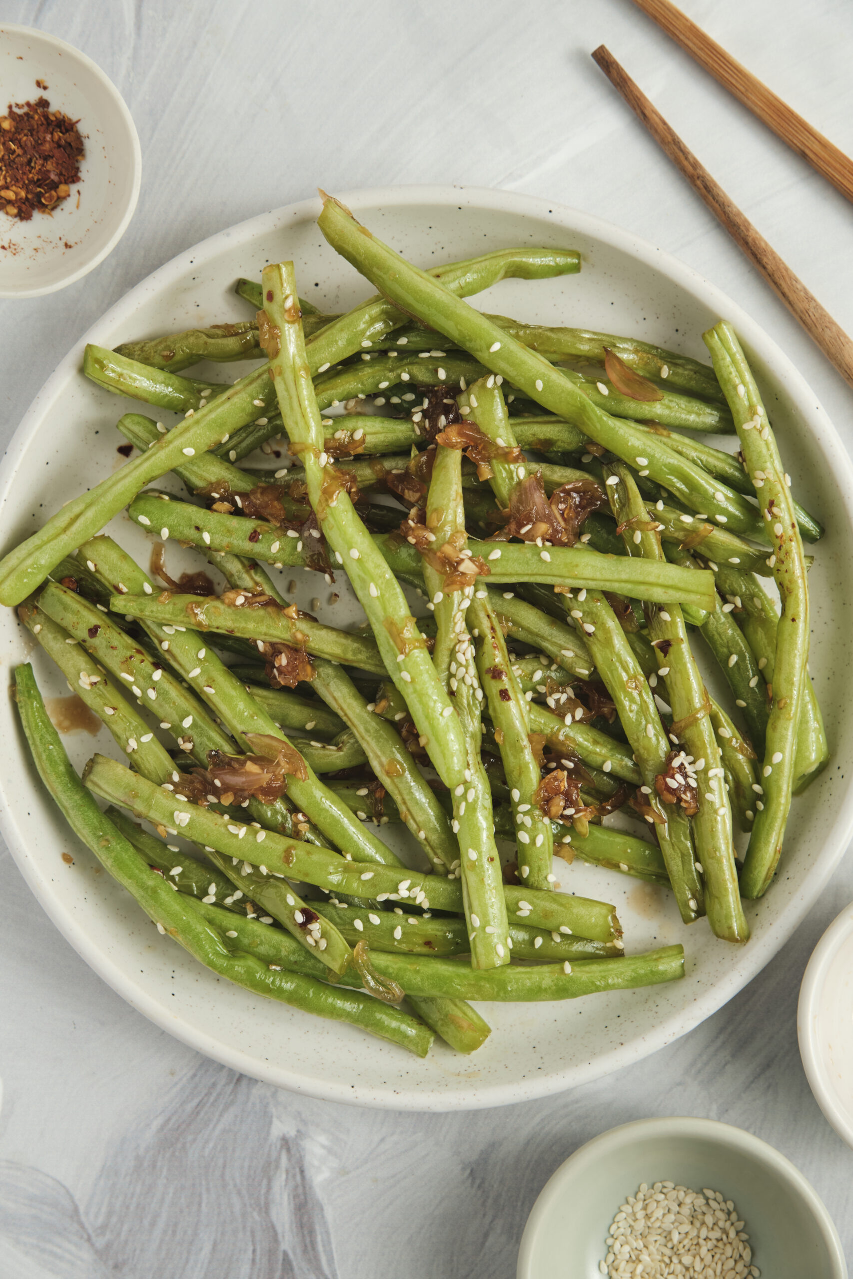 - Finally, sprinkle the sesame seeds and red pepper flakes (if using) over the beans and serve hot.