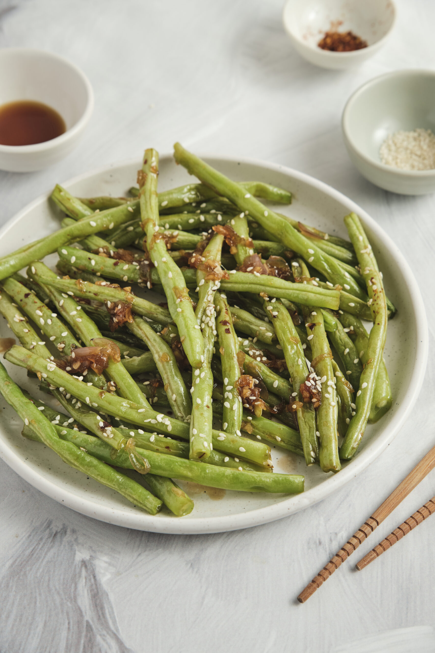 Once your Asian green beans have cooled to room temperature, transfer them to an airtight container. Refrigerate for 3-4 days. Then you can either heat up a portion in the microwave for 30-60 seconds or lightly sauté them in a pan with oil on the stove. When they’re completely warm, serve your leftovers and enjoy.