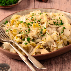 Although raw cabbage tastes bitter and crunchy, it wilts beautifully when cooked, sweetened by aromatic seasonings. Mixed together with delicate onion slices and minced garlic, braised cabbage is the ideal savory companion dish for all kinds of mains. As a succulent side, it shines bright next to steak and potatoes. As a topping, it goes great on pasta. I’ve also seen people top their braised cabbage with smoky bacon bits to enliven the whole dish. However you choose to play with it, braised cabbage is a dazzling little dish that every chef ought to have up his or her sleeve.