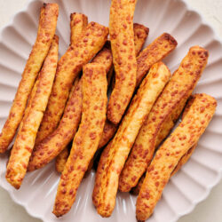 Traditional in both the Southern US and England, cheese straws are a clever cross between crisp biscuits and cheesy crackers. Since they’re shaped like French fries, they’re also incredibly versatile, easily dipped in all kinds of sauces. While I enjoy dipping cheese straws in hummus, my husband usually prefers ketchup. So, while they’re excellent to snack on, they also make a great appetizer at parties. Not only that, but you could easily serve them as a side to mains like burgers or steak.