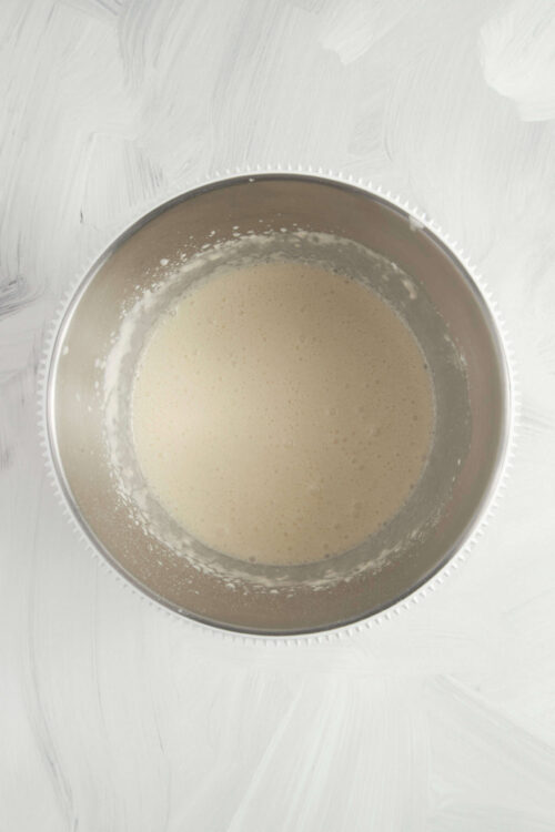 - Slowly whisk the dry ingredients into the egg and milk mixture until the batter is smooth. Stir in the melted butter.