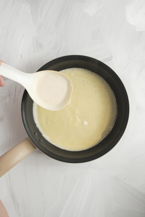- Heat a nonstick skillet over medium heat and brush with a little extra melted butter. Pour about 1/4 cup of batter into the pan and quickly tilt the pan to spread the batter in a thin layer.